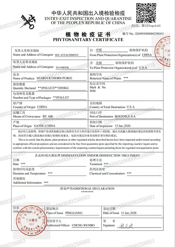 Under China’s export regulations, Sea Buckthorn Puree (HS Code: 20098916) is classified as a functional juice requiring mandatory Export Inspection and Quarantine.